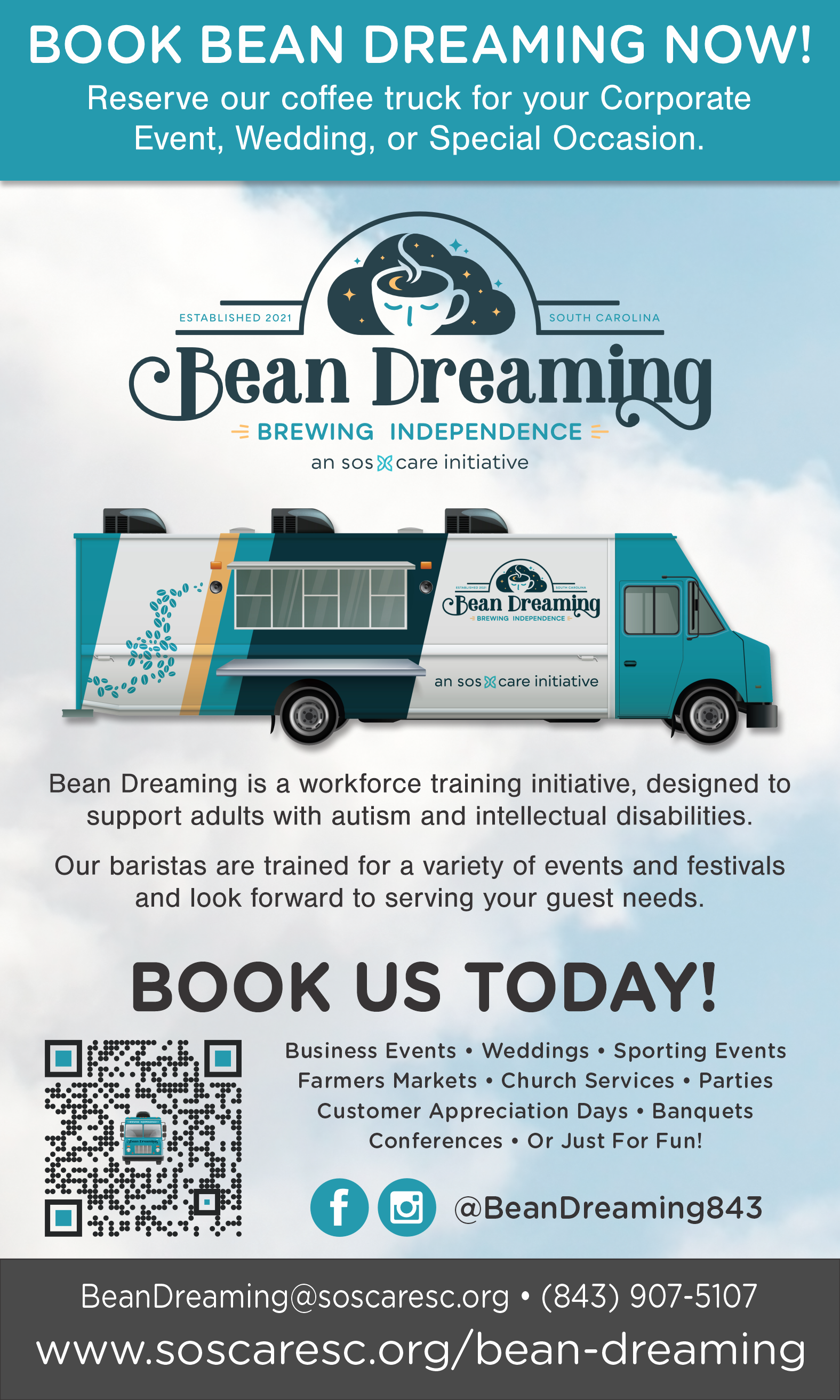 Imagine a world where everyone gets a shot at their dreams— where a cup of coffee isn’t just a morning boost, but a symbol of opportunity, inclusion, and empowerment. That’s what The Bean Dreaming mobile coffee truck is brewing up every single day. We’re not just serving lattes; we’re training adults with intellectual disabilities and autism to become skilled baristas, giving them the tools to build confidence, independence, and a paycheck through an innovative approach to vocational training.